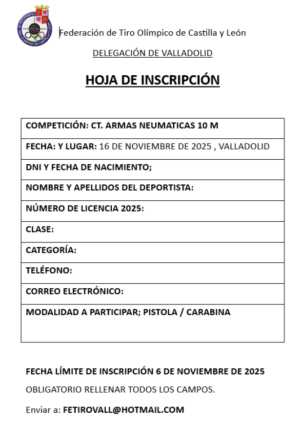 inscribirse en las tiradas del calendario oficial de la Delegación de Valladolid, deberán aportar con un MINIMO de 15 días de antelación la siguiente documentación: