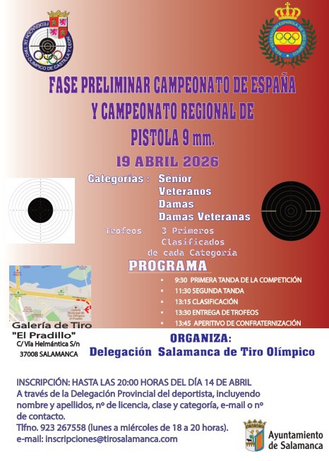 EL SÁBADO DÍA 7 DE DICIEMBRE SE CELEBRARÁ LAS VOTACIONES A MIEMBROS DE LA ASAMBLEA TERRITORIAL DE LA FEDERACIÓN DE TIRO OLÍMPICIO DE CASTILLA Y LEÓN EN LA MESA ELECTORAL SITUADA EN LA DELEGACIÓN DE SALAMANCA, PARQUE DE LA ALAMEDILLA S/N, 37003 SALAMANCA, EN HORARIO DE 10,30 A 13:30 HORAS.